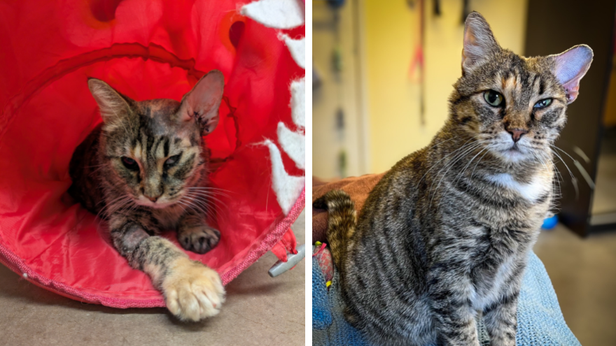 Now healing from her big surgery, Karen is getting used to hearing out of just one ear. She needs daily medicated drops, but she’s become very cooperative for them. Karen loves gentle pets and rubs against her people for affection. This loving feline has been in our care many months, patiently working on her health and learning to trust people again. Could you share your kind heart with Karen today to help her on her road to recovery?
