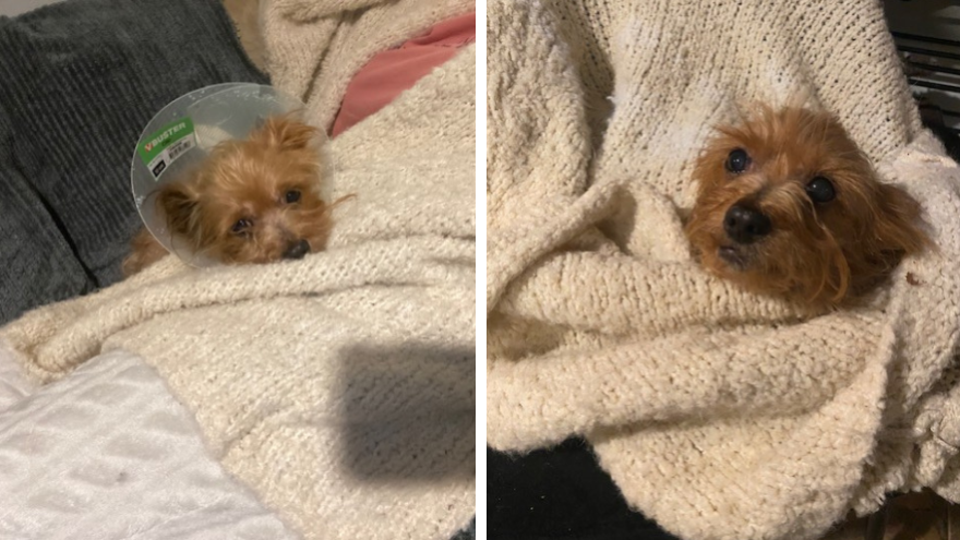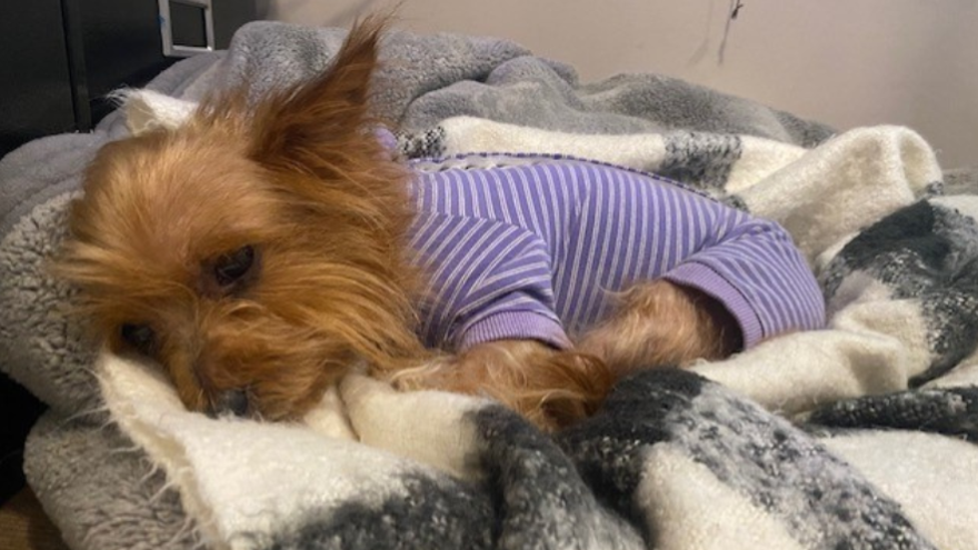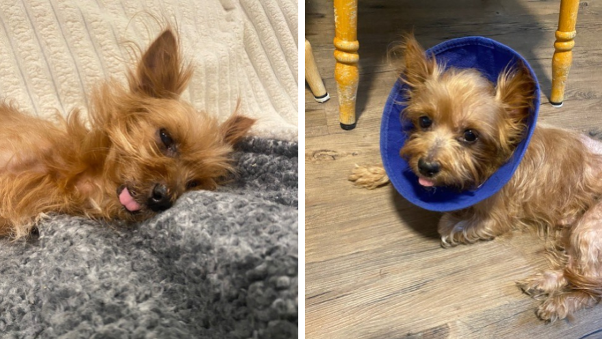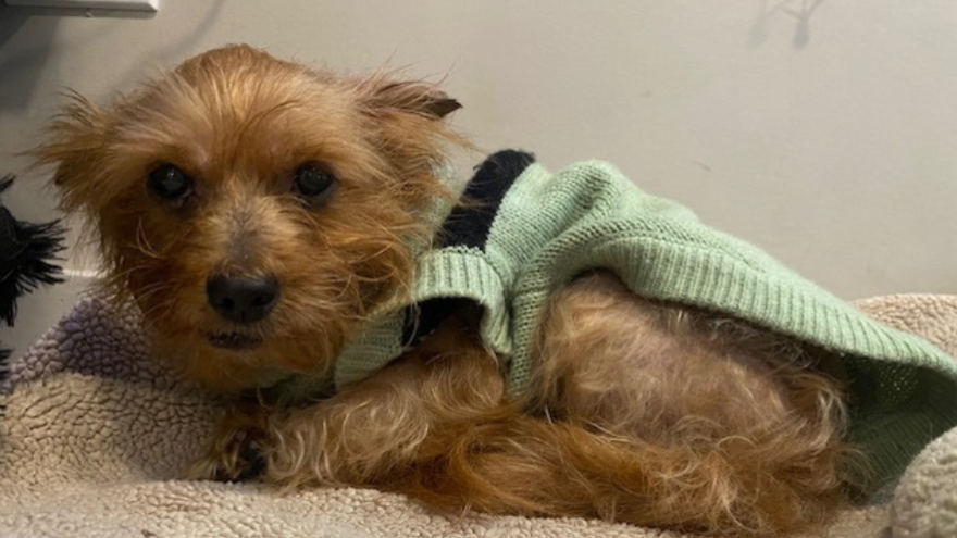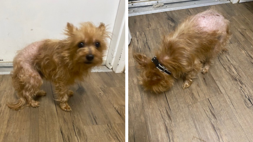 Sweet little Peanut needs a lot of loving care to heal. This eleven-year-old senior Yorkshire Terrier was brought to us with major hair loss, itchy skin, and a painful mouth.
