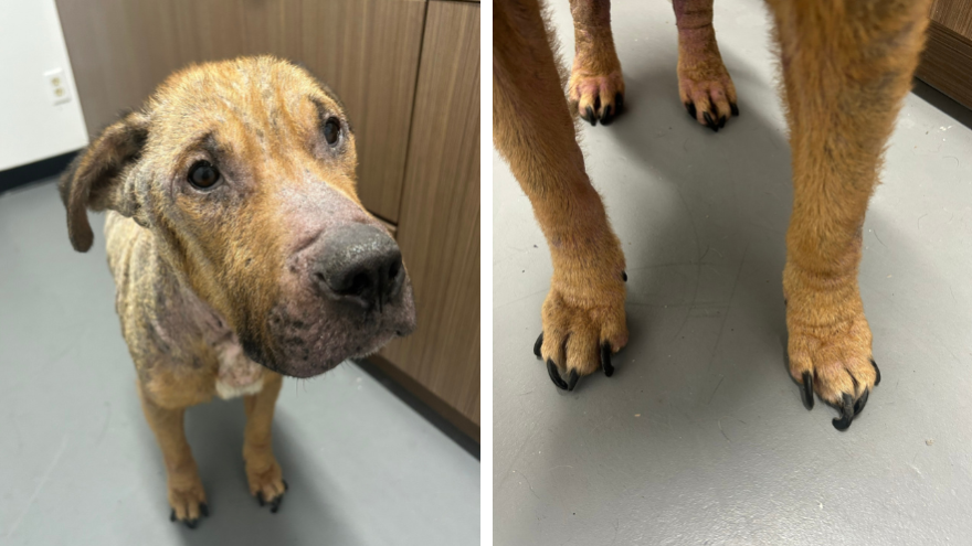 Rupert needs extensive medical care to overcome his pain. Under the gentle care of his medical team, blood was drawn for testing, and his body was carefully examined. Rupert is suffering from mange, and his hairless, dry, inflamed skin needs serious attention. He also has wounds on his back, likely from trying to scratch himself to relieve his discomfort. His bloodwork shows he’s dealing with anemia too. Everything about his body is making poor Rupert uncomfortable, from his overgrown nails to his broken tooth and painful ear infection. He’s also thinner than he should be.