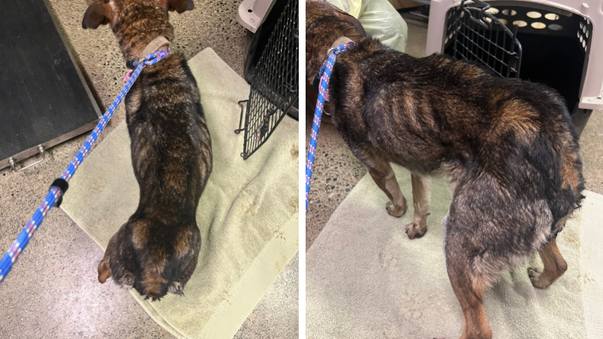 Bella was rushed to a nearby animal hospital for careful examination right away. Her medical team found that she was emaciated, with a greasy, itchy coat, overgrown nails, and parasites. Her body is fragile, and there’s a risk of re-feeding syndrome, which can happen when starving animal starts eating again. Bella was placed on a strict refeeding plan to help her safely regain her strength. To help her coat, she needs regular baths and ear cleanings to keep her comfortable, and her health is being monitored with bloodwork. Her medical team are monitoring her health through bloodwork and urine testing. And finally, Bella needs an oral surgery so she can eat comfortably.