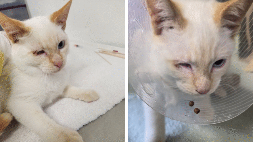 Now resting in a loving foster home, Captain is working on healing and soaking up all the comfort and affection he can get. Despite everything he’s endured, this one-eyed sweetheart hasn’t lost his playful, loyal spirit t — he follows his people everywhere and meows happily for their attention when he wants it.